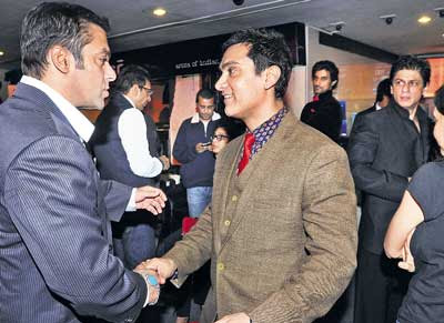 Bollywood Celebrities Shah Rukh Khan and Salman Khan, Aamir Khan, Sharman Joshi, R Madhavan, Sanjay Dutt, Kareena Kapoor, Dia Mirza, Imran Khan, genelia D'souza, Arshad warsi, Adnan Sami, Anil Ambani with wife Tina Ambani, Anil Kapoor, Saif ali khan at 3 Idiots movie premiere